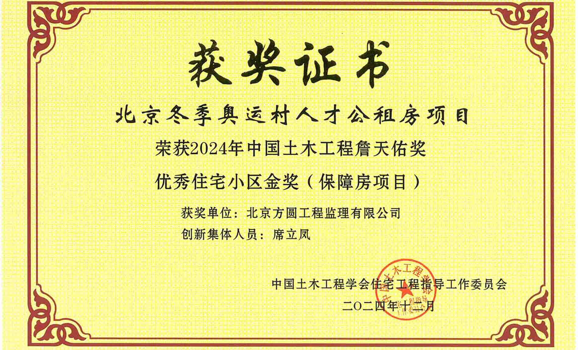 近日,由中国土木工程学会评选的2024年度詹天佑奖揭晓,我公司监理的北京冬奥村人才公租房项目荣获中国土木工程学会评选的2024年度詹天佑奖,该项目凭借其卓越的设计理念、高标准的施工质量以及绿色环保的创新实践,